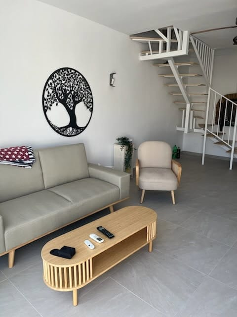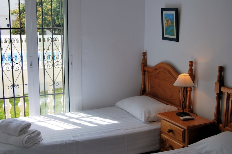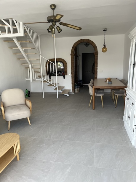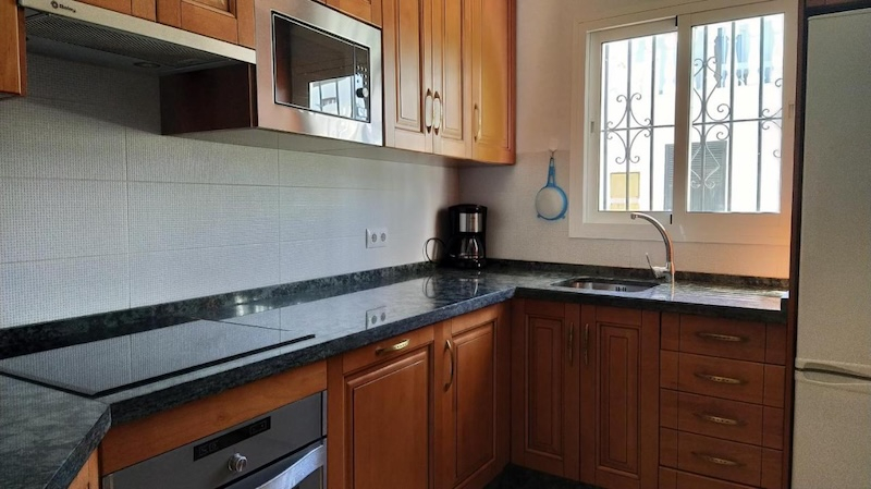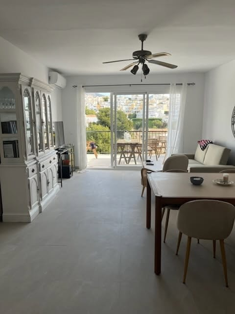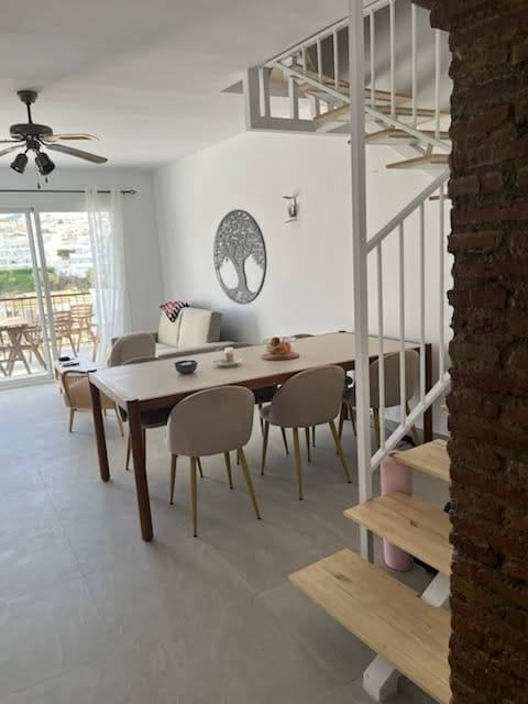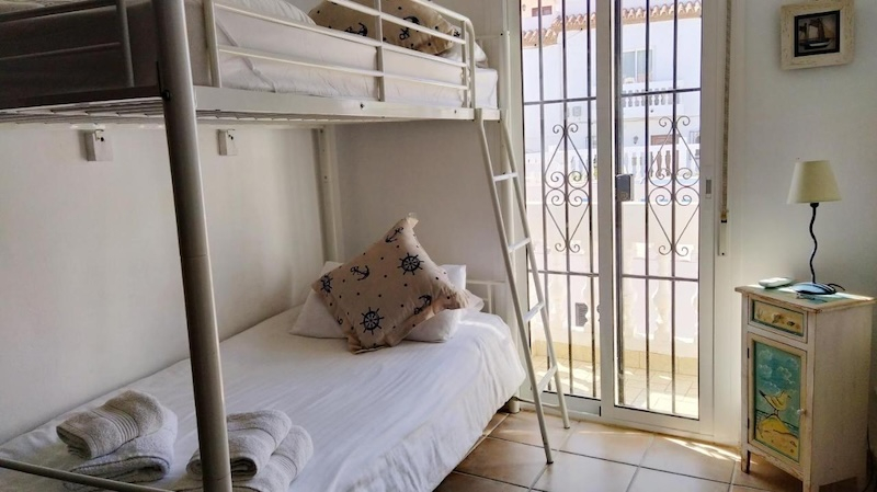 La Hacienda 22 in Nerja is a charming and quiet, very well equipped apartment, close to the Burriana beach. Located in a gated community with communal gardens and a large communal swimming pool, it is an ideal place for families and couples. The house is built over two floors, on the ground floor there is a large living room/dining room with fireplace, comfortable sofas, flat-screen TV, patio door leading to a beautiful terrace with views to the sea and the mountains. The kitchen is completely independent and is fully equipped with ceramic hob, electric oven, large fridge-freezer, microwave, dishwasher and all modern comforts. On this floor there is also a cloakroom with toilet and washing machine. A spiral staircase leads to the second floor where there are three bedrooms. The main bedroom has a large double bedroom with fitted wardrobes, a Juliette balcony , and an en-suite bathro with shower The second bedroom is a large room with two single beds and the third bedroom has bunk beds (twin), both with built-in wardrobes and access to a small balcony. These two bedrooms share a family bathroom. All rooms are air conditioned and there is free Wi-Fi Internet service.